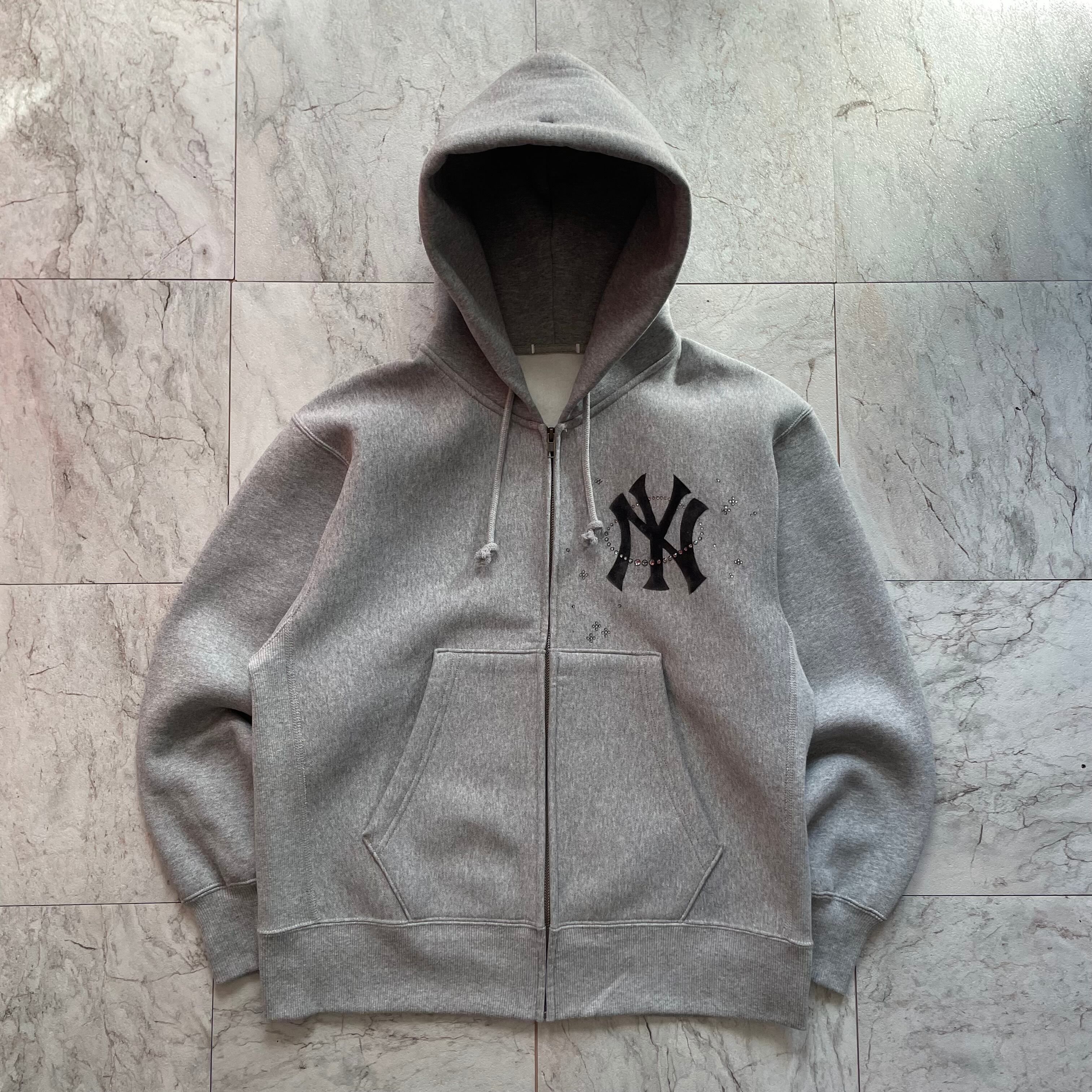 宇宙をモチーフに作ったジップパーカー。土星のようにNYロゴの周りを輪で囲み、その周辺には星のイメージのラインストーンを散りばめました。パーカーと同系色のラインストーンにすることで主張しすぎず、かっこいいストリートに落とし込めるデザインです!