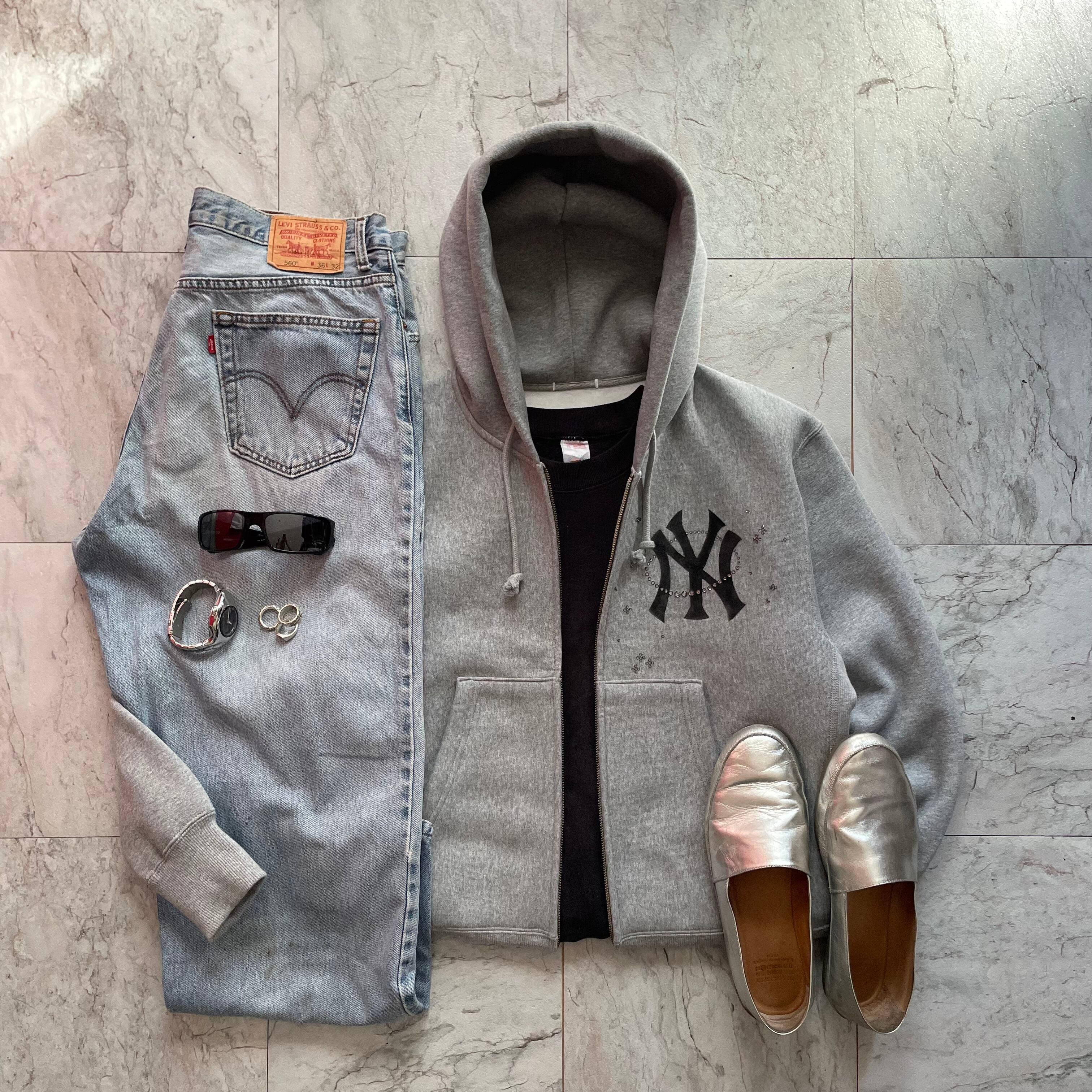ラインストーンを散りばめたカスタムジップパーカーとLEVI’Sの560を合わせた海外スタイル。