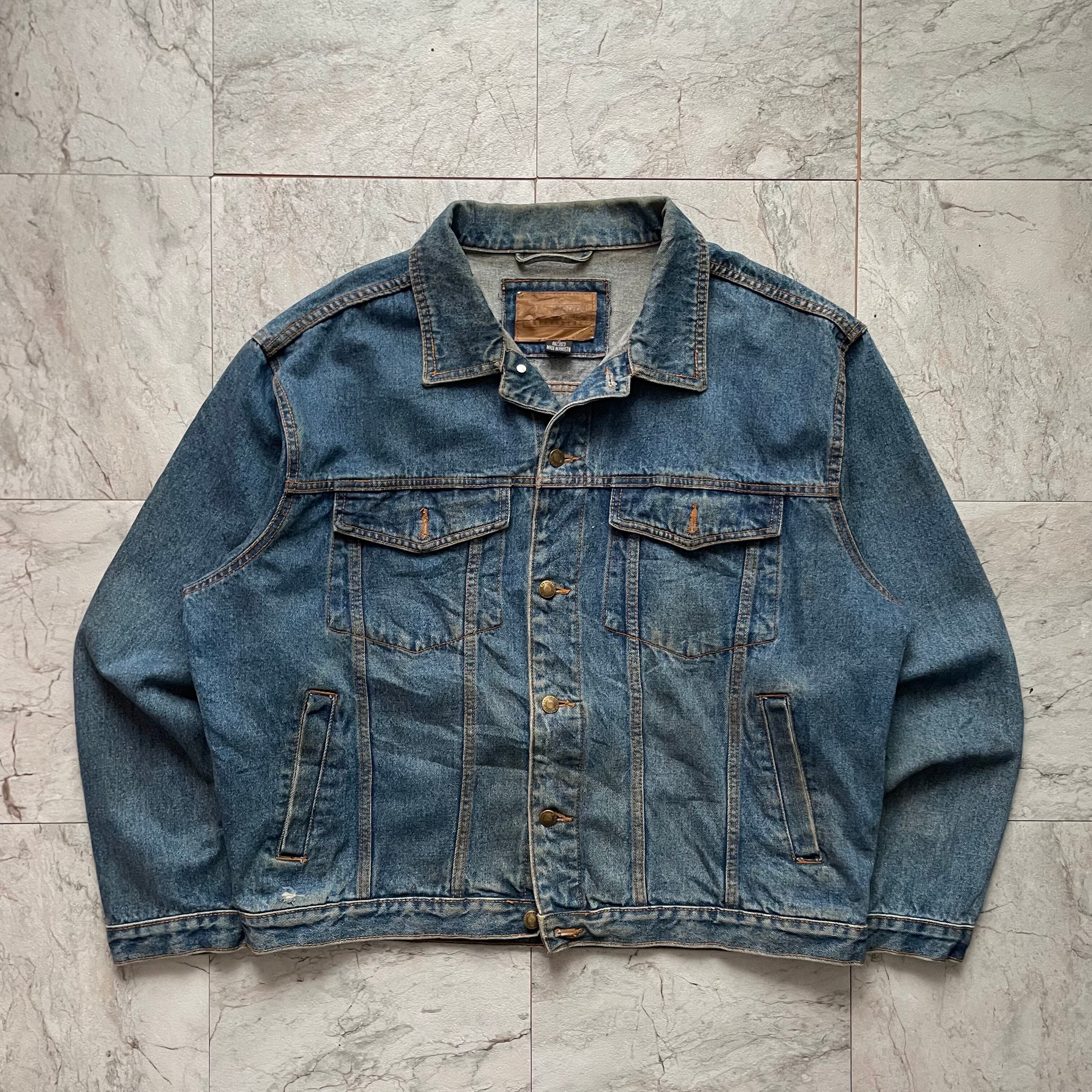 ビンテージのデニムジャケットとトラックパンツを合わせた海外スタイル。