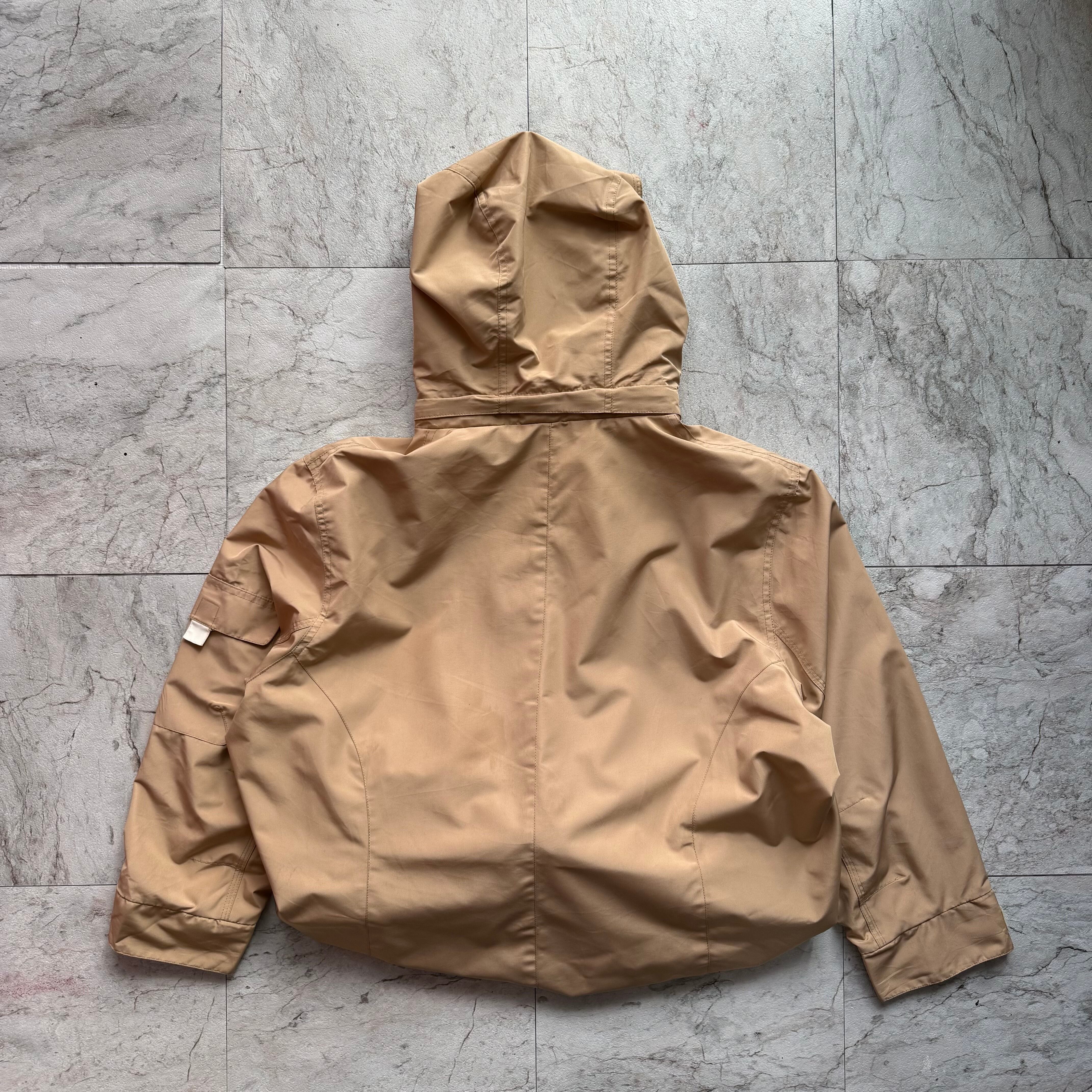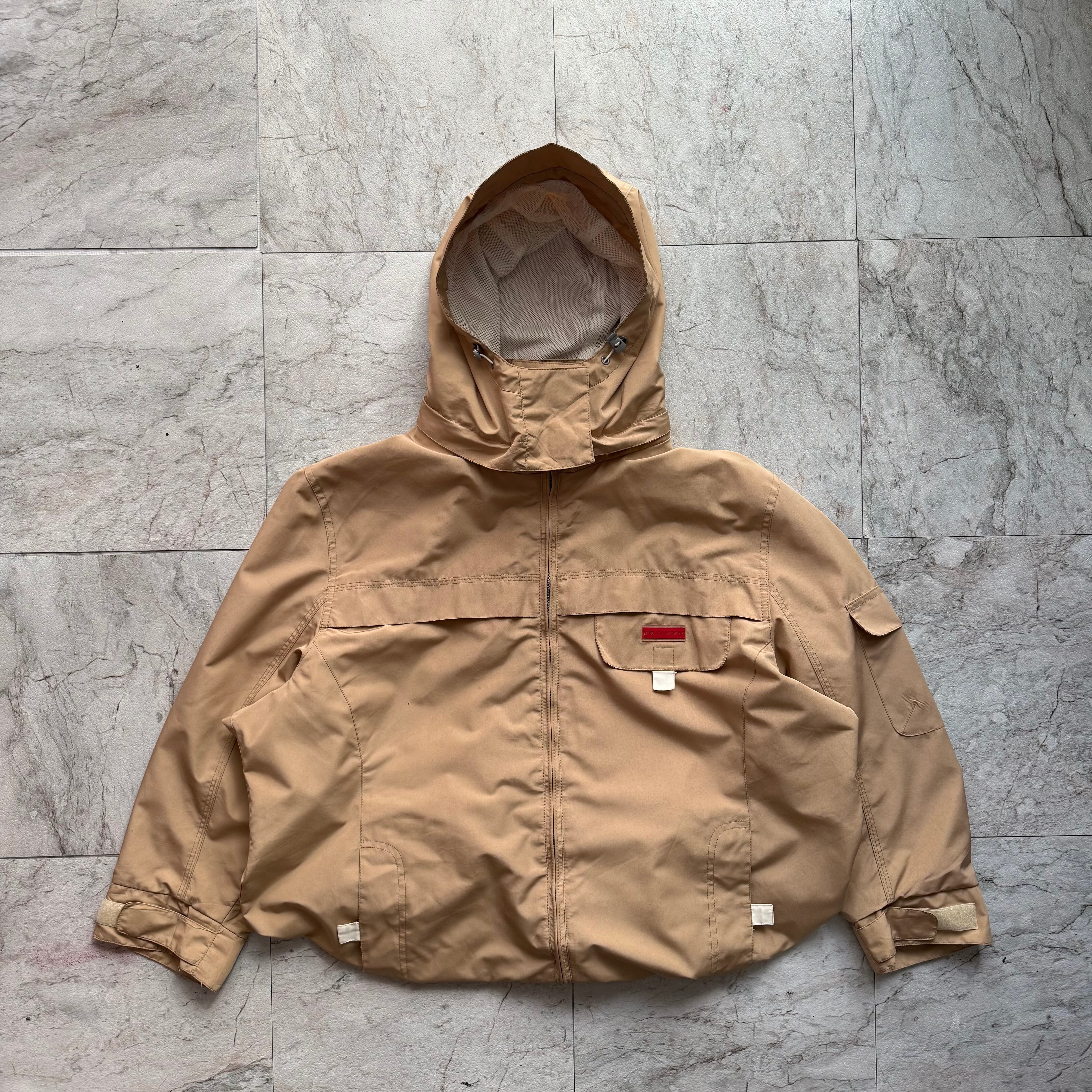 アウトドアブランドのナイロンジャケットとシルエットの良いハーフパンツで合わせたシティースタイル。