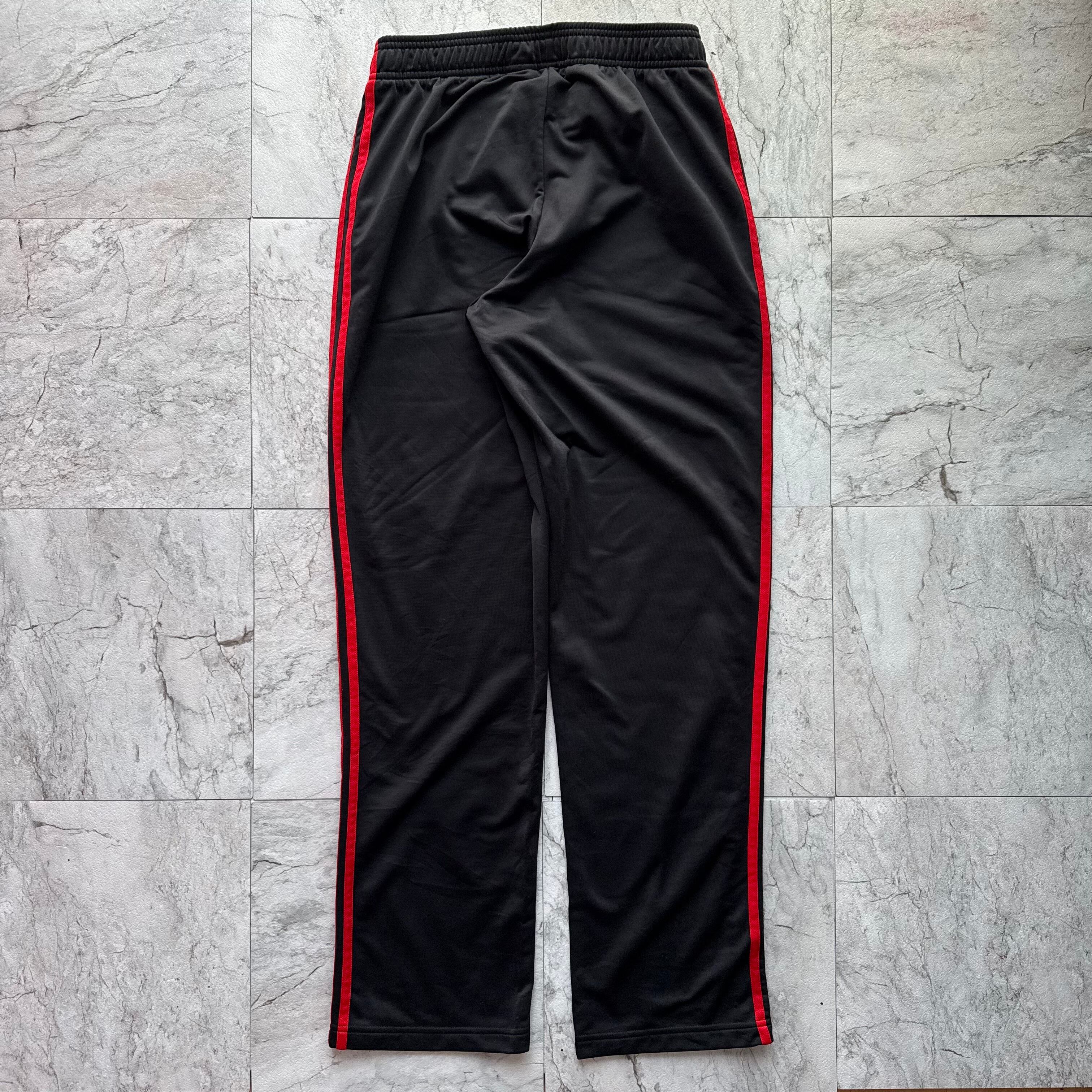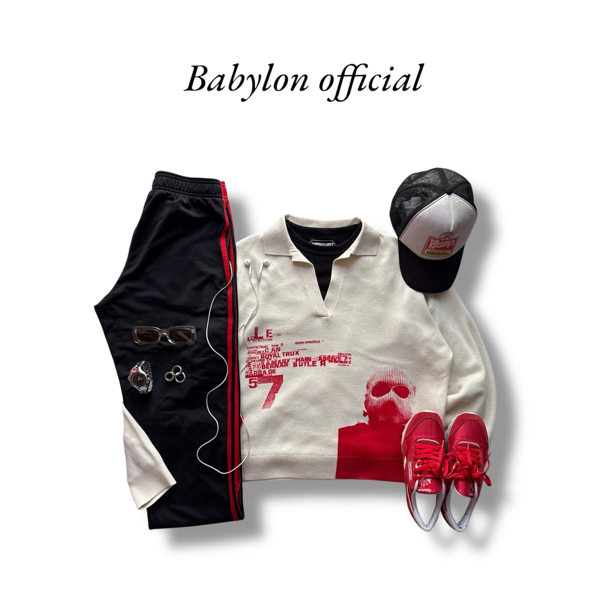 短丈ニットポロシャツとアディダスのトラックパンツを合わせた海外スタイル。