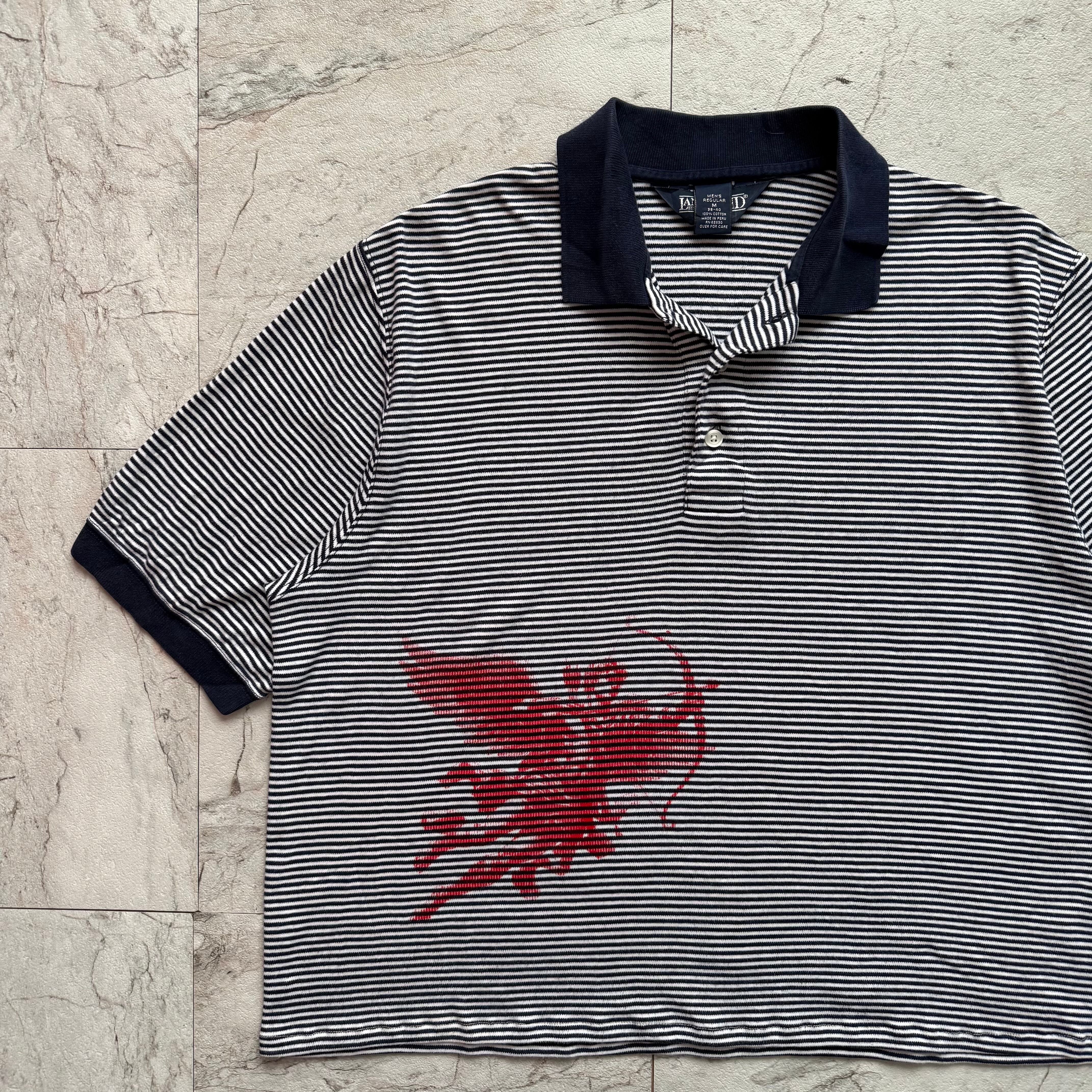 90’sライクなボーダーポロに、赤のグラフィティプリントを重ねた印象的な一着。太めのLevi’sデニムと組み合わせ、足元はレザーシューズで引き締めるのがオススメです!