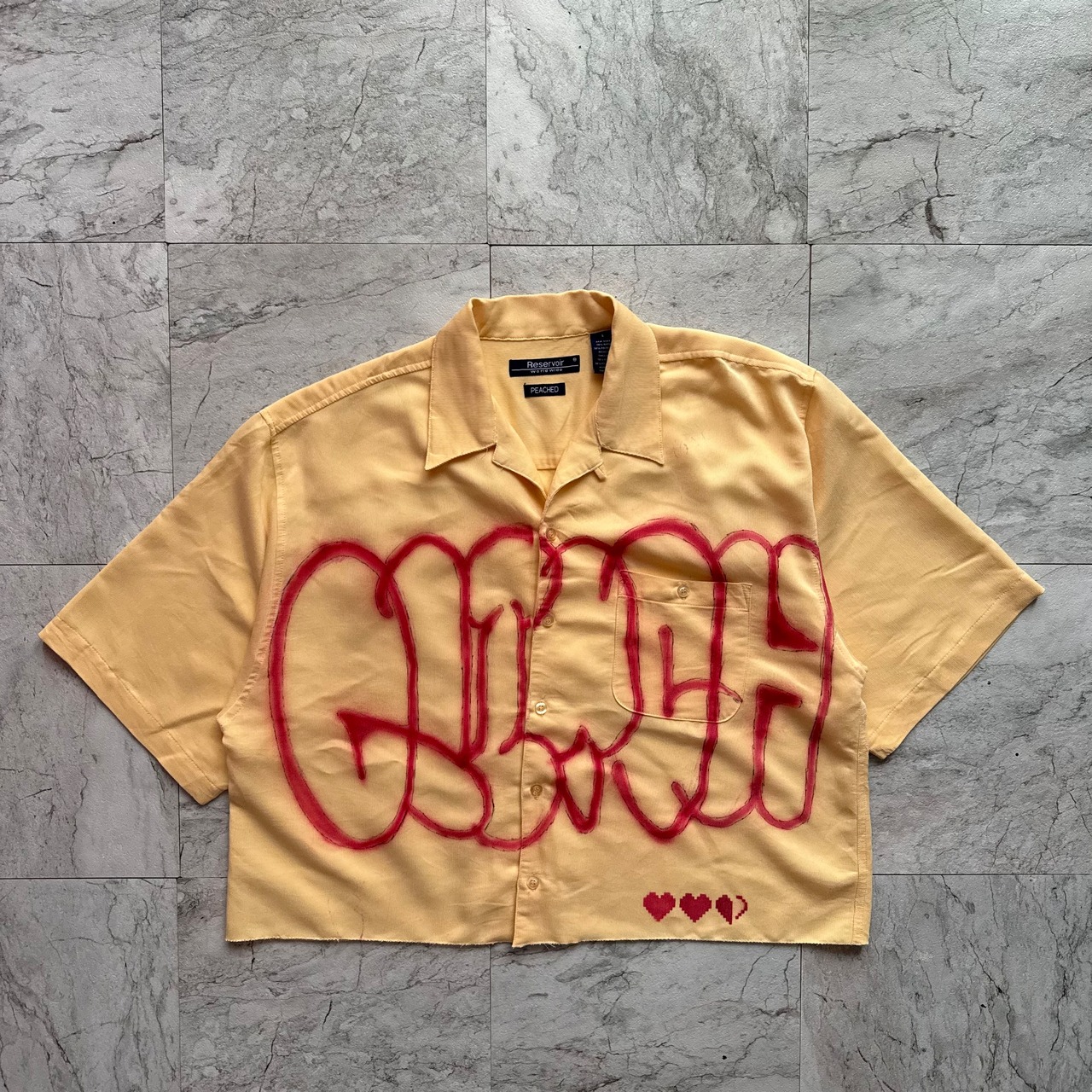 レトロな開襟シャツに、バブル感のある筆記体グラフィティが書かれたアイテム。デニムとスニーカーを合わせることで、ストリート×ポップな90年代カルチャーをイメージしました!ストリート色が強くかっこいいスタイルです!