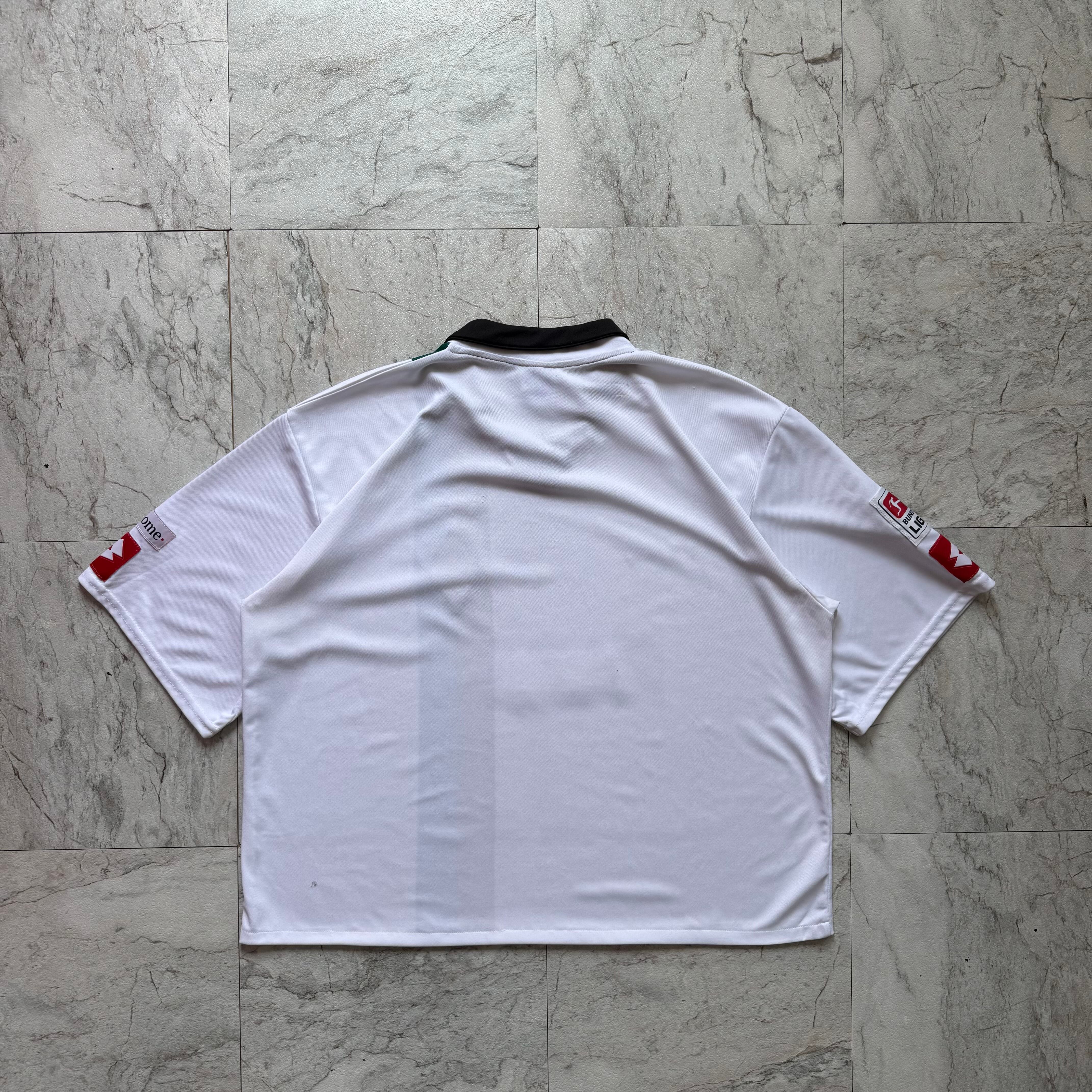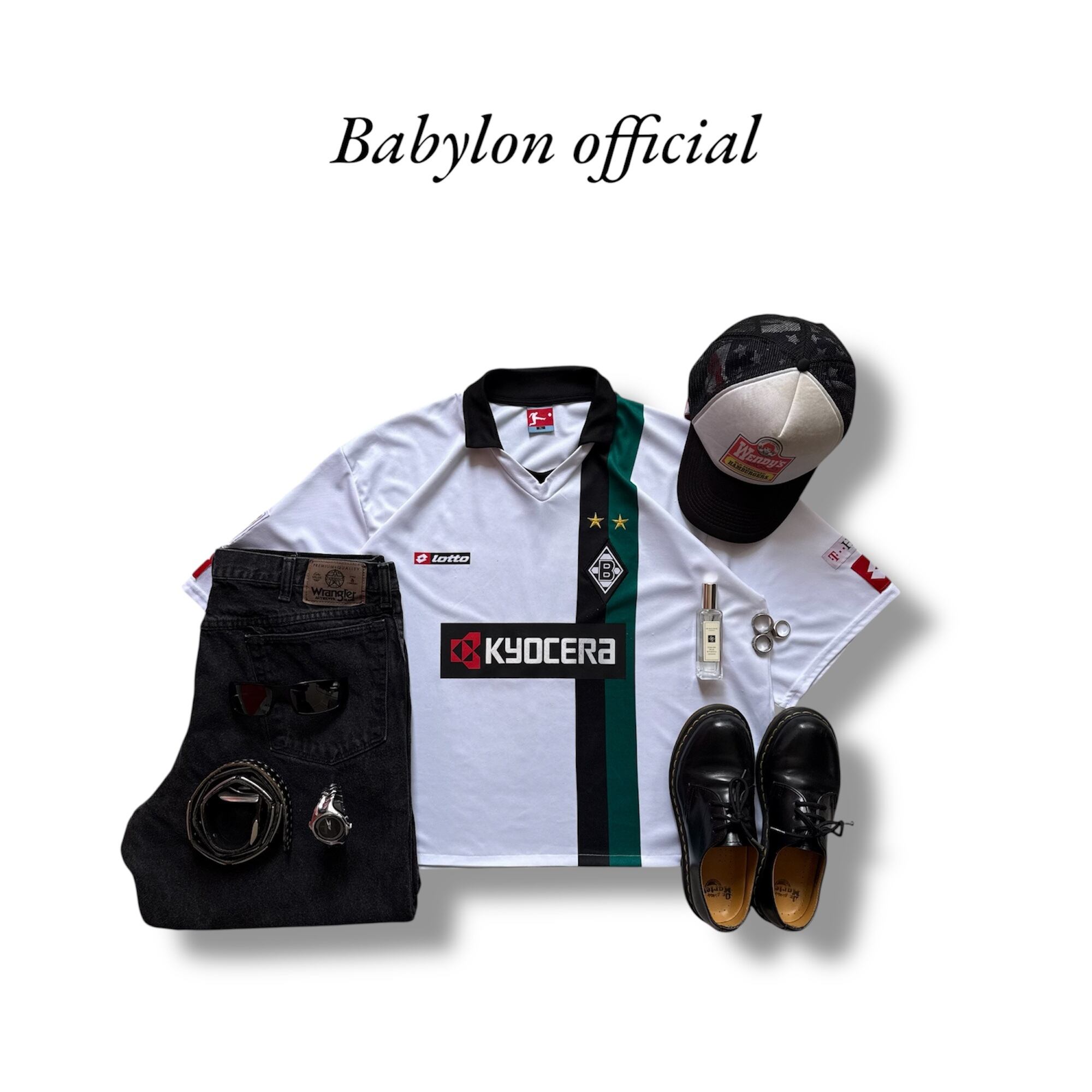 ドイツのサッカーチームジャージをモチーフにした、レトロスポーティーなトップス。ボディのラインとロゴが際立つデザインで、ブラックデニムと合わせてストリートライクに。カラーを絞った分、シルエットで魅せるスタイルです。