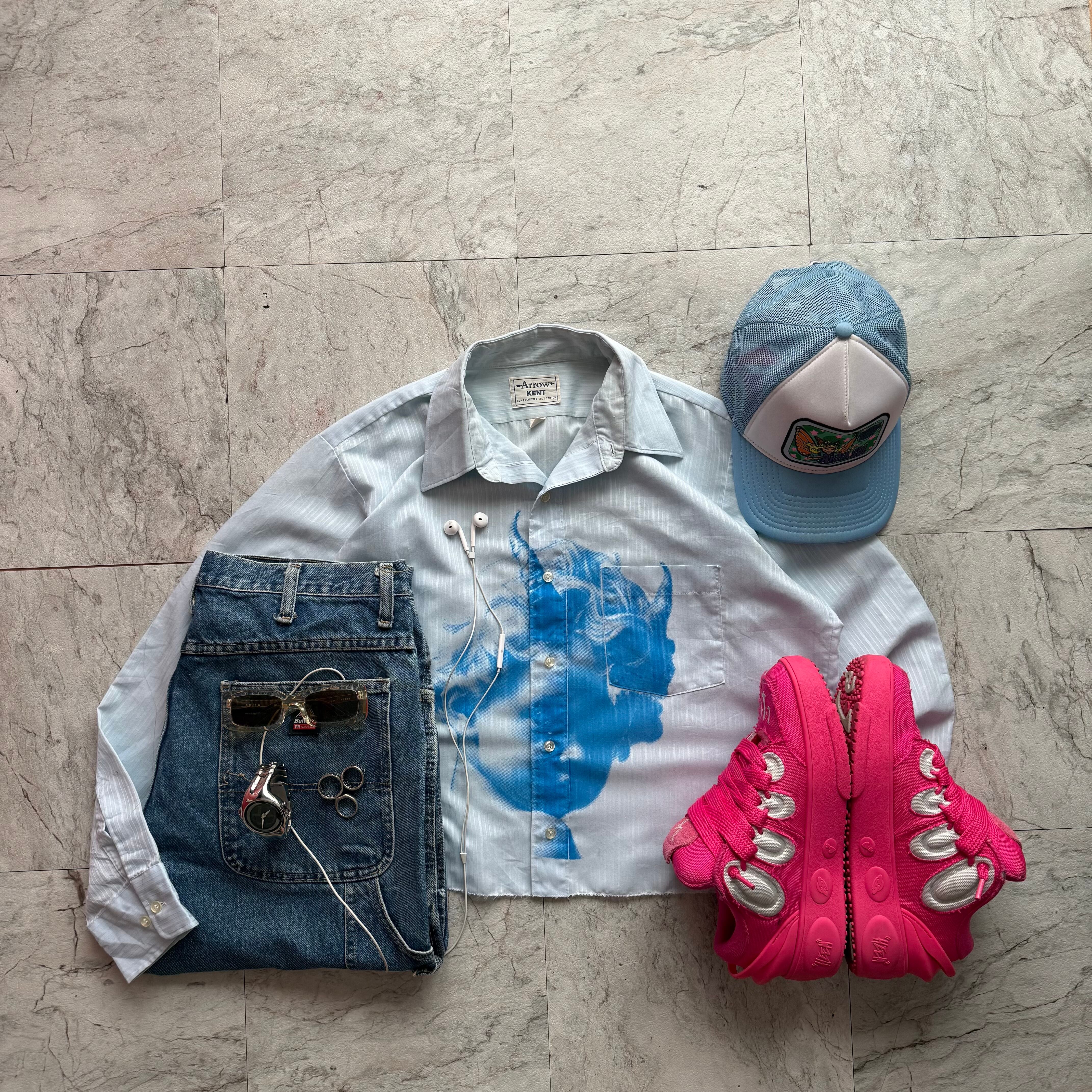 存在感のあるブルーグラフィックが目を惹く、ショート丈ストライプシャツ。少し光沢感のある素材で清潔感を演出。ウォッシュが効いた太めのストレートデニムを合わせ、Y2Kとストリートを掛け合わせた絶妙なミックススタイル。