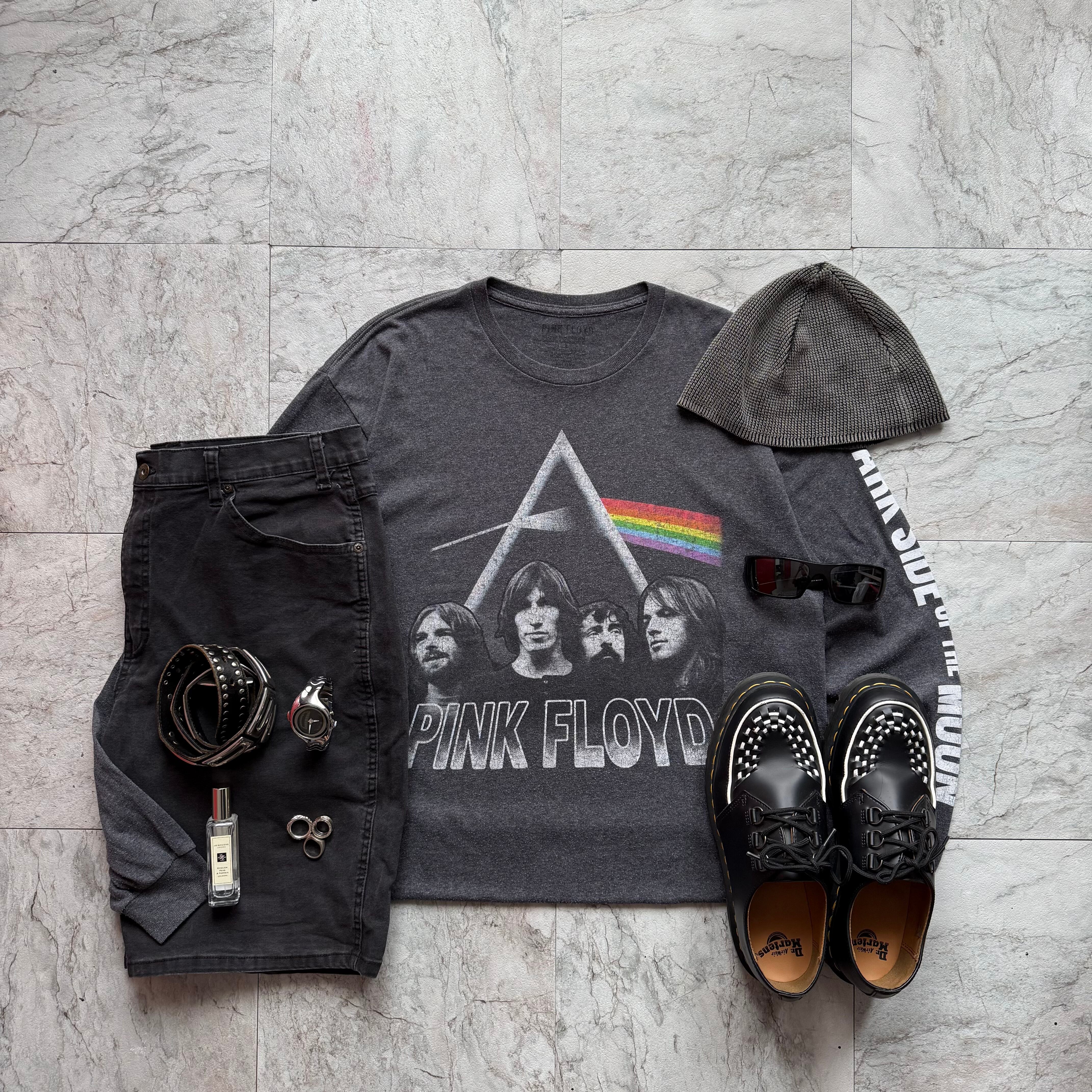 伝説的バンド「Pink Floyd」のグラフィックがプリントされたヴィンテージライクなロンTに、ウォッシュブラックのショーツを合わせた音楽カルチャー感じるスタイル。パンツは太めのW36サイズで、シンプルながらシルエットに存在感を持たせています。