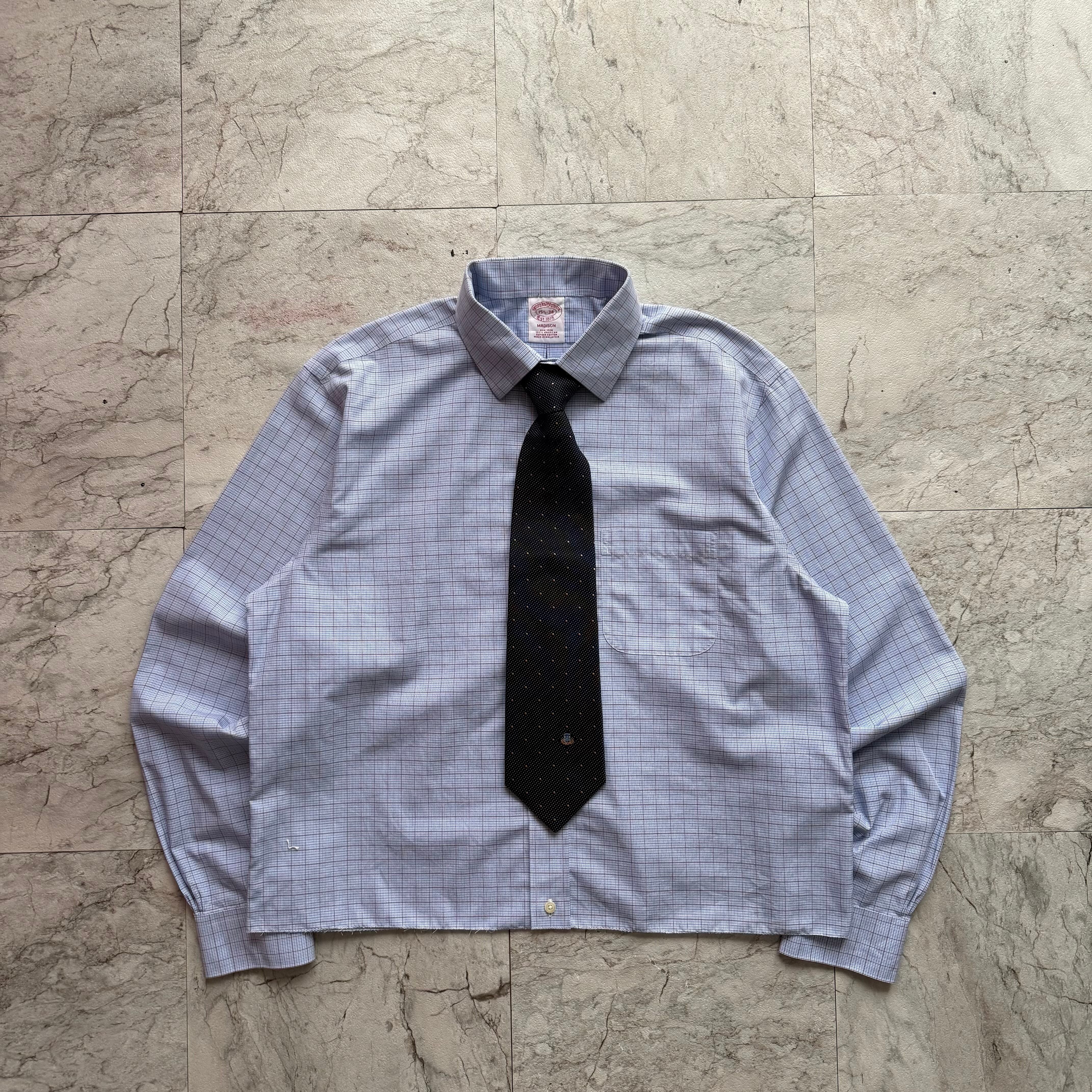 ブルーのチェックシャツにドット柄のネクタイを合わせ、スクールライクな雰囲気を演出。