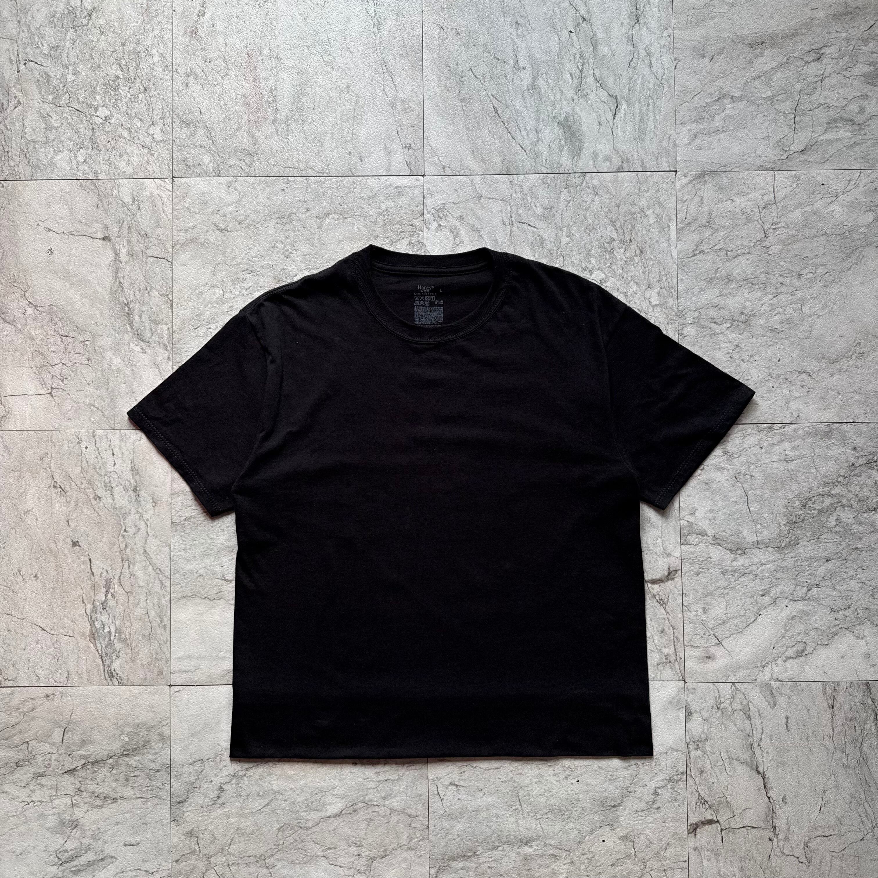 ブラック無地の短丈Tシャツがミニマルなノームコアスタイル。タイトすぎずルーズすぎない絶妙なバランスのシルエットで、どんなボトムスにも馴染みやすい一枚。