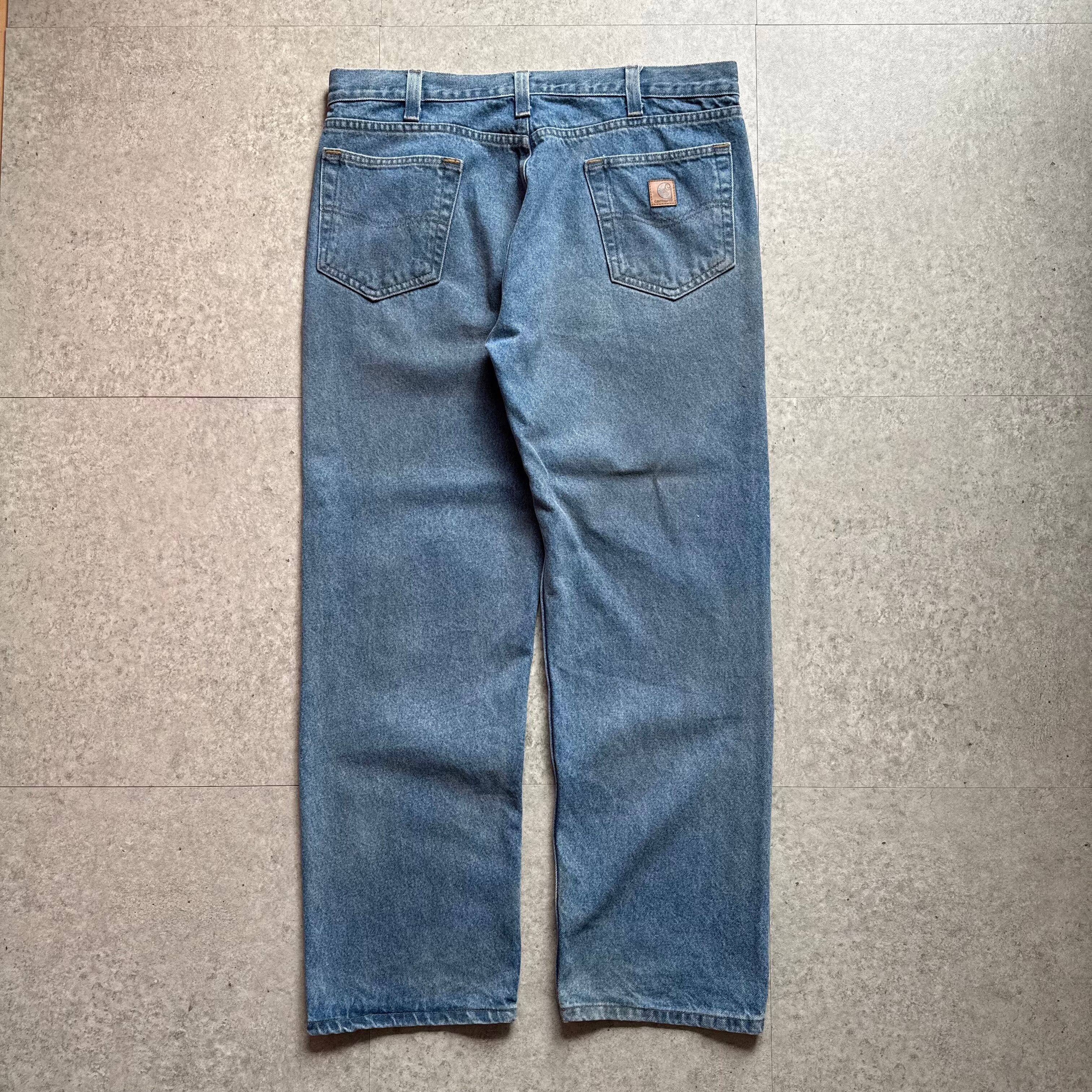 パンツは色落ち感が絶妙なブルーデニム。リペア跡のあるダメージ加工がスタイルにこなれ感をプラスし、ロールアップで足元の抜け感も演出。カジュアルからストリートまで幅広く合わせられます。