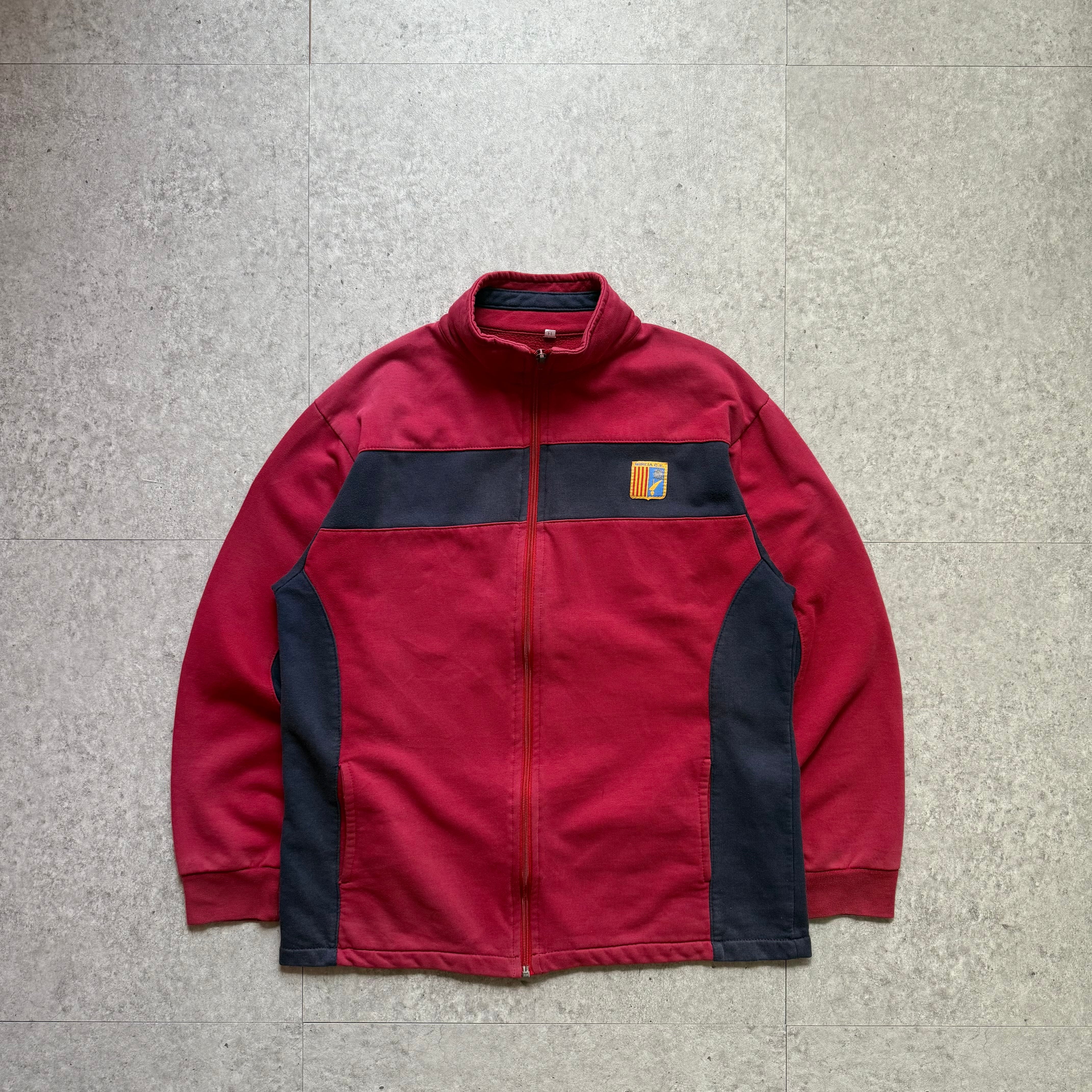 深みのあるバーガンディとネイビーの切り替えが映えるジップアップジャケット。胸元の小さなエンブレムワッペンがアクセントになり、スポーティさの中にレトロ感をプラス。しっかりとした生地感で、季節の変わり目にも着やすい一着です。