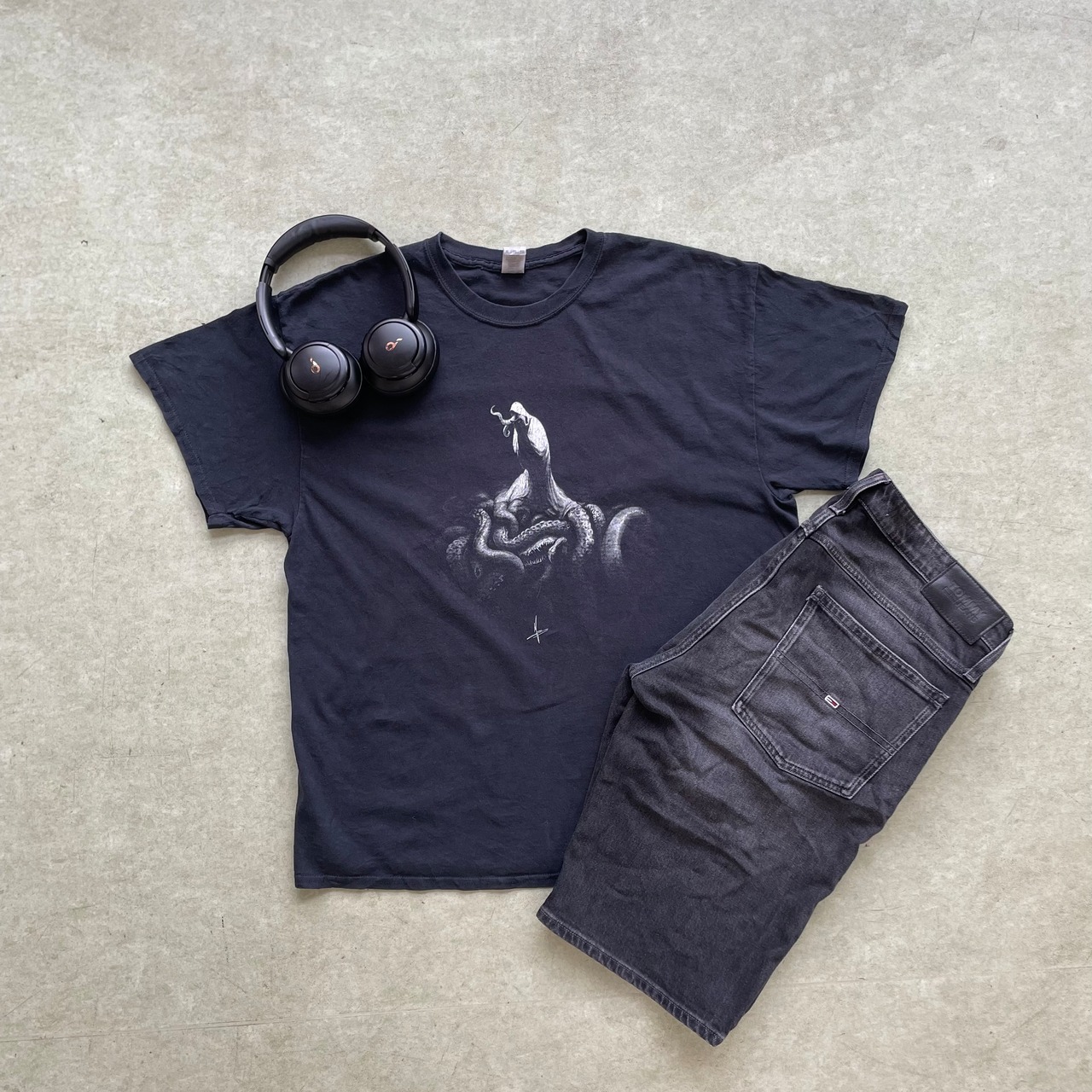 デザインプリントTとブラックデニムのハーフパンツを合わせたストリートコーデ。