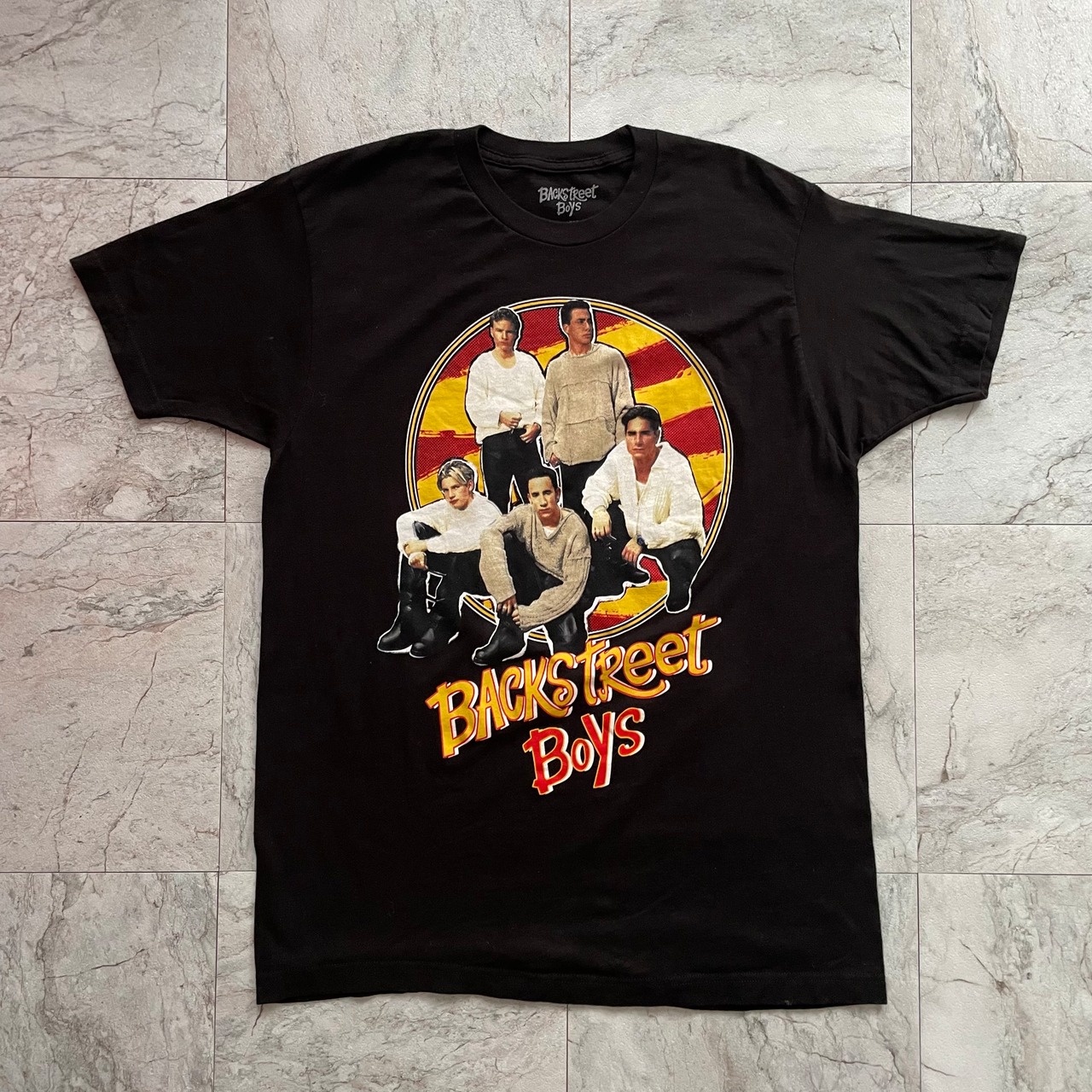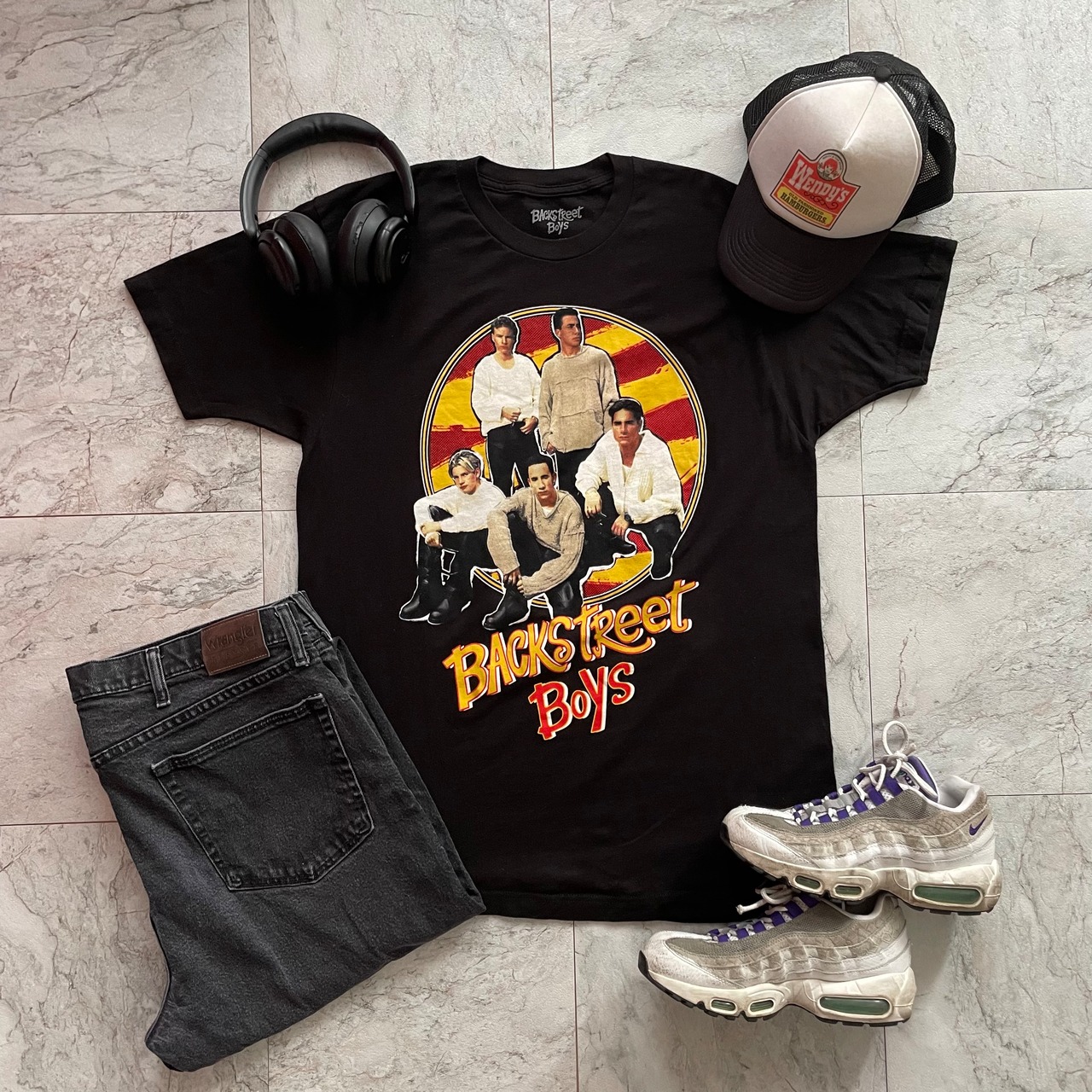 バックストリート・ボーイズのプリントTにブラックデニムを合わせた海外風スタイル。