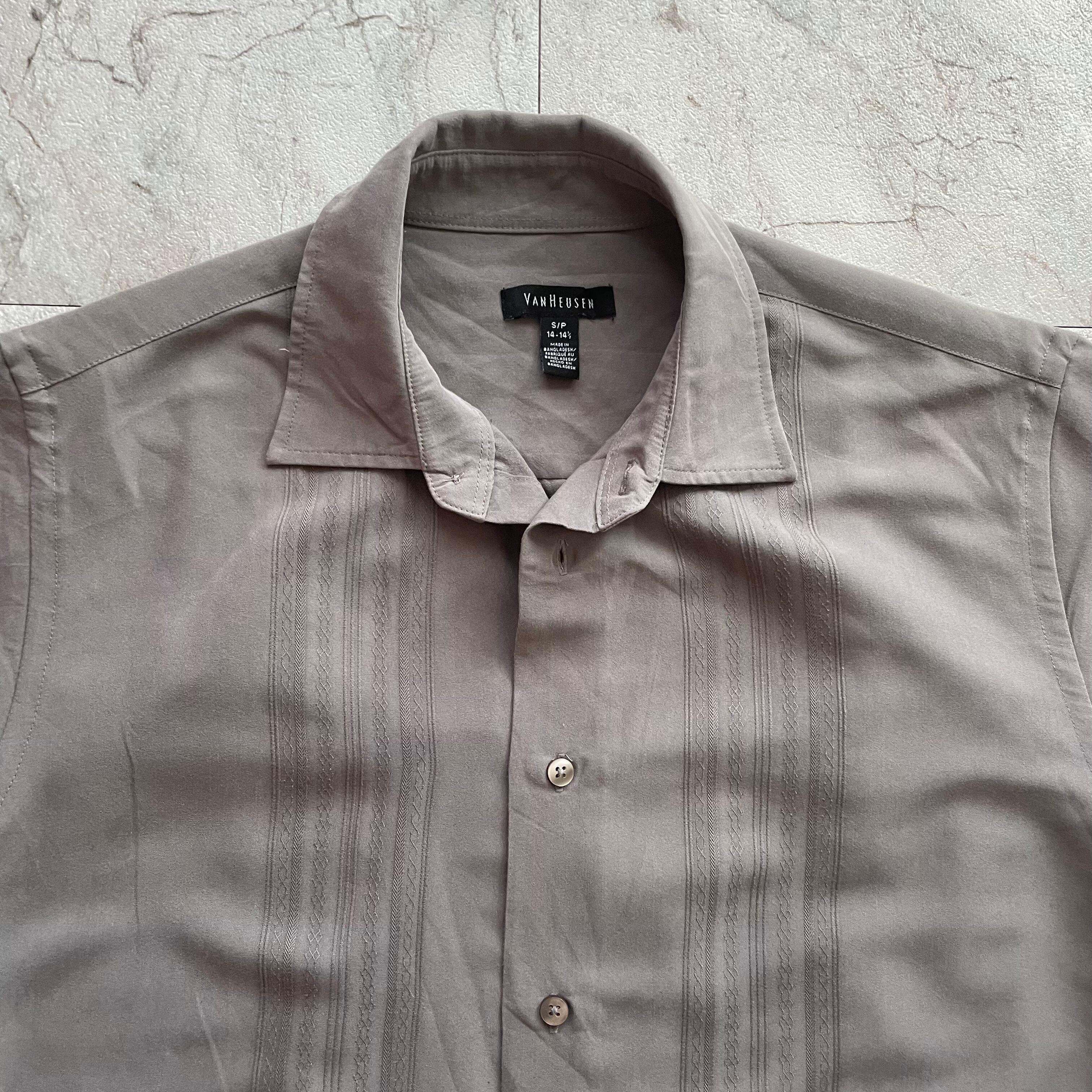 バンハウスのビンテージのシャツにストライプのスラックスを合わせたアメカジスタイル。