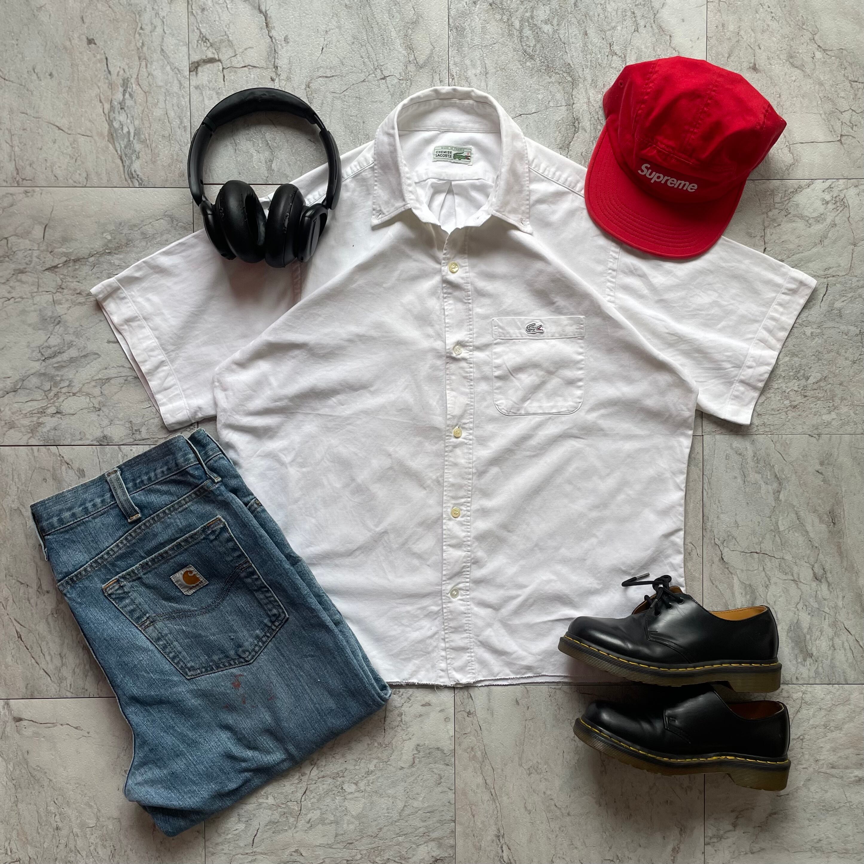 身幅に対して着丈が短い短丈のボックスシルエットのシャツが可愛いです。カーハートのデニムも古着ならではのペイントがついててとてもおすすめです