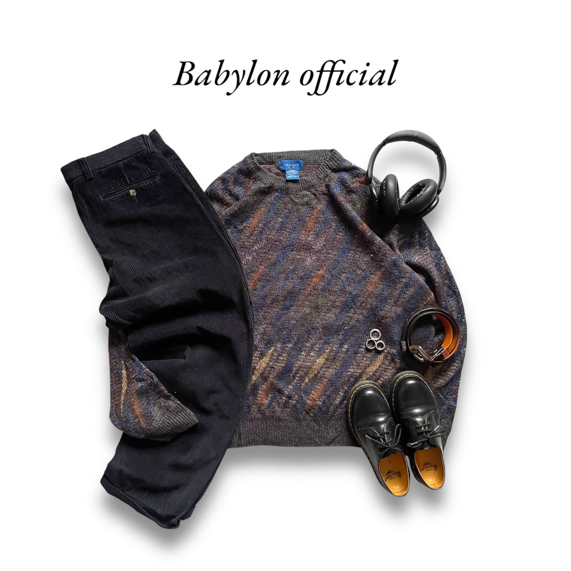 タウンクラフトのニットとユーロビンテージのコーデュロイパンツを合わせたキレイめスタイル。