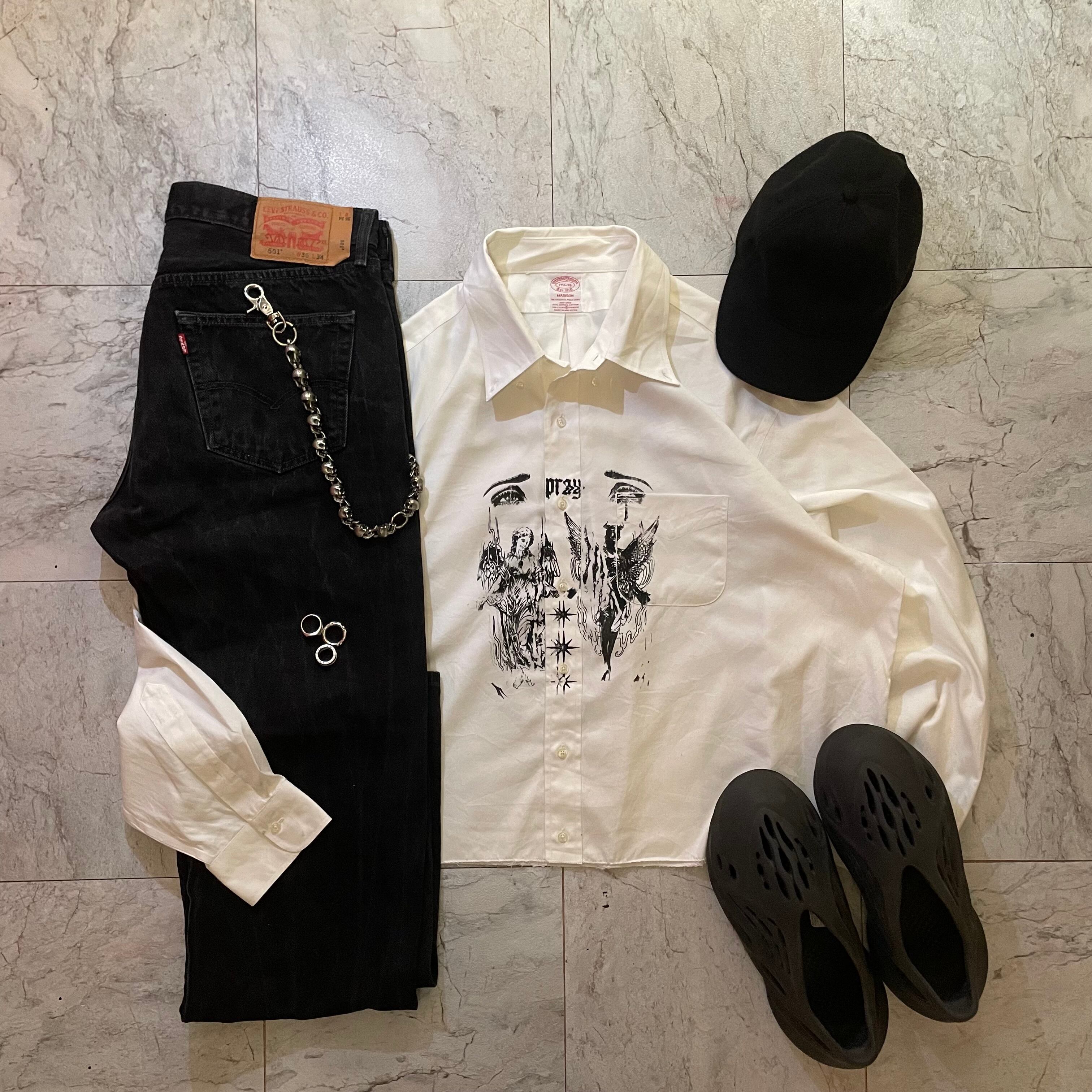 フロントにデザインのある短丈白シャツとブラックデニムを合わせた海外ストリートスタイル。