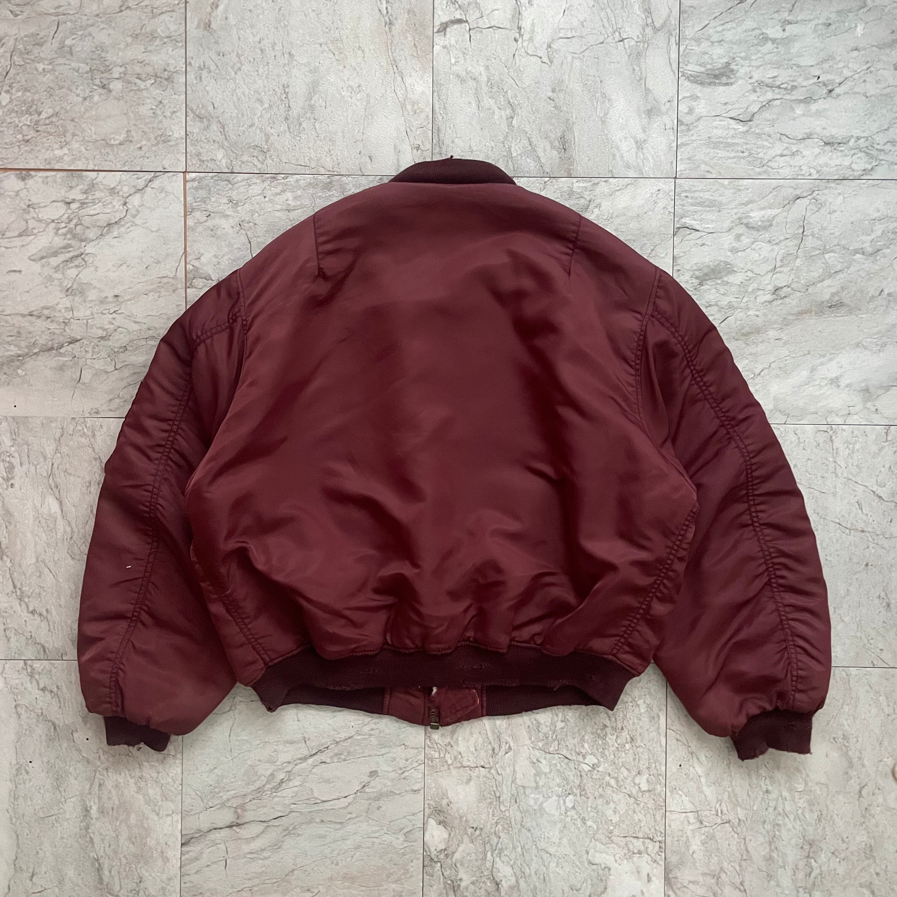 短丈シルエット、フェードしたワインレッドのカラー、所々のダメージ具合が雰囲気を出していてとてもかっこいいアイテムです。個人的にもボロボロの古着が好きで買い付けました。