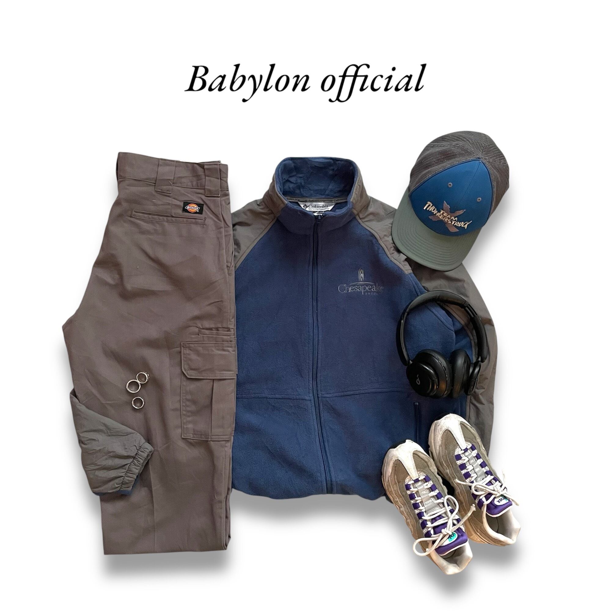 コロンビアのナイロンフリースとディッキーズのカーゴパンツを合わせたゴープコアスタイル。