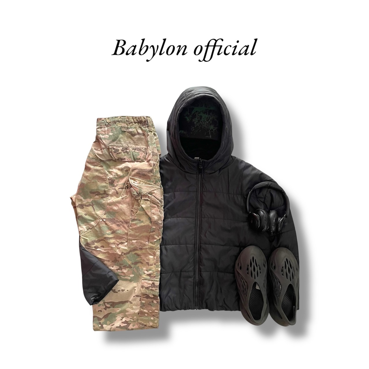 トップスはフード付きのダウンジャケットでバックデザインのデカロゴNIKEが海外スタイルにマッチしてかっこいいです。パンツは太めのデジタルカモで合わせて海外ストリートを意識したスタイリングです!