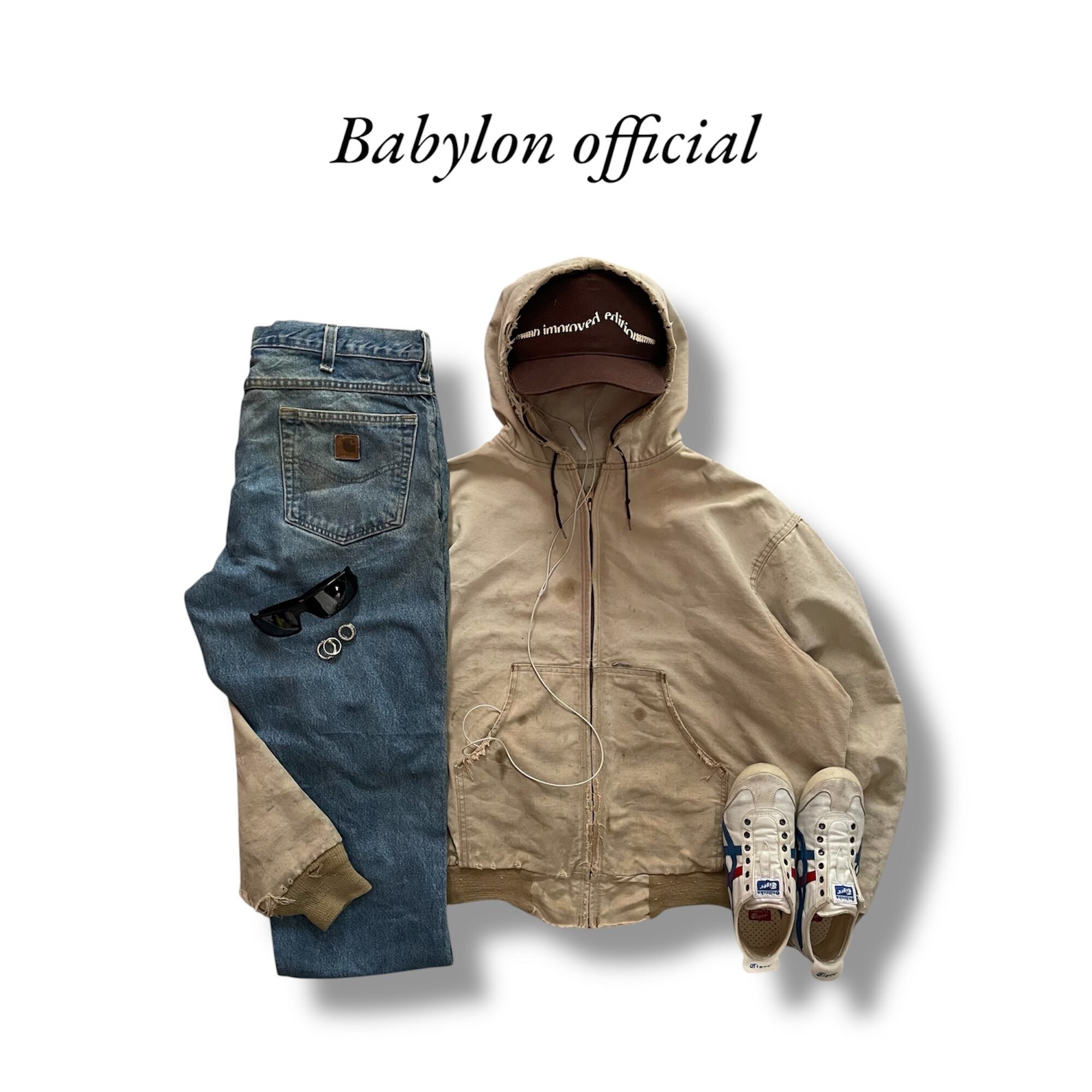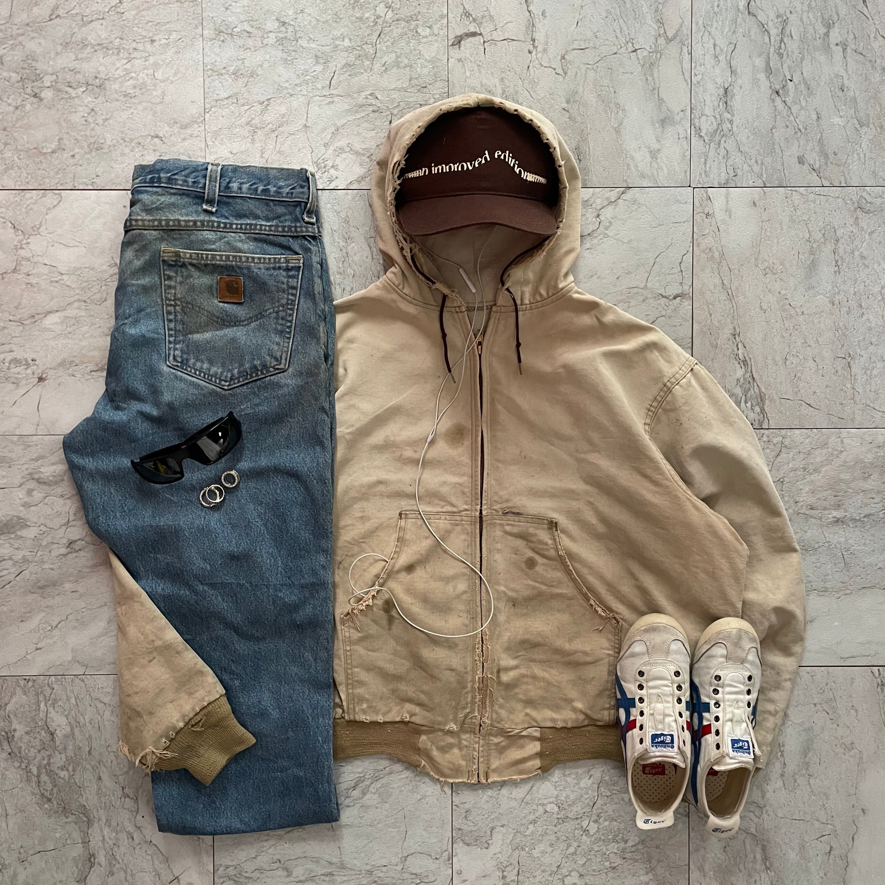 ビンテージ特有のダメージのあるアクティブジャケット。色々な箇所が剥き出しになっていてかなりのダメージ具合で非常にかっこいいアイテムです。サイズ感も非常に良く、個人的には綺麗なアクティブジャケットよりこのダメージがありまくりのアイテムのが好きです。パンツも太めのカーハートで合わせてまとまりのあるスタイルにしました!