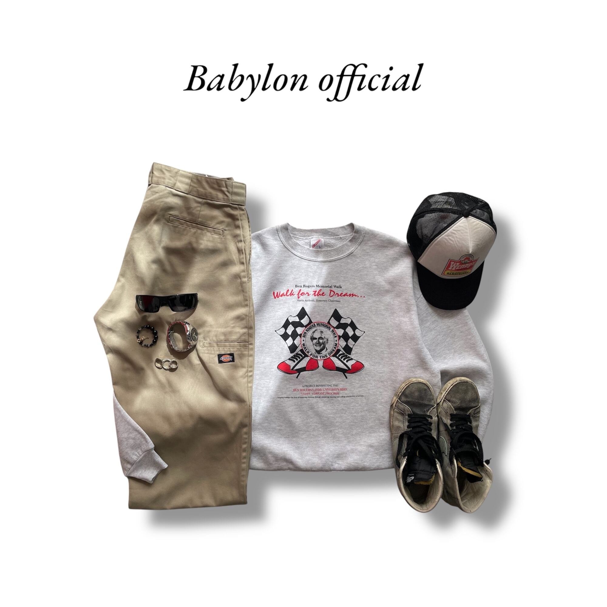 アメリカ製ビンテージのスウェットとディッキーズのダブルニーを合わせた海外スタイル。